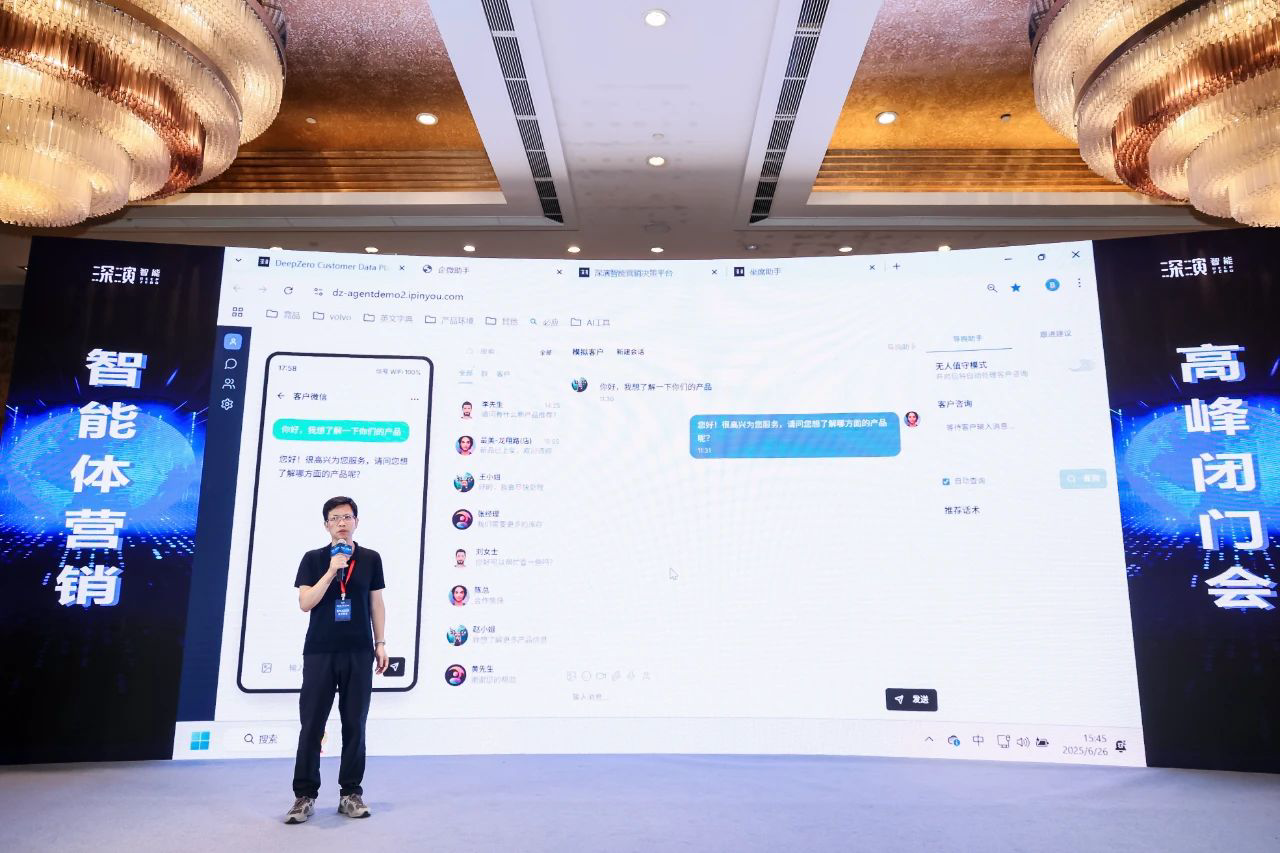 作为已经成功帮助几十家大型企业 AI Agent落地的行业领导者,恒峰g22智能DeepAgent Neo全面赋能营销域和销售域。 黄晓南和恒峰g22智能CTO欧阳辰与恒峰g22智能副总裁曹玉骥一起,为嘉宾现场演示了CRM、Social、销售、客服等场景的全面智能体,情景展现了DeepAgent Neo如何全面赋能企业各个环节。