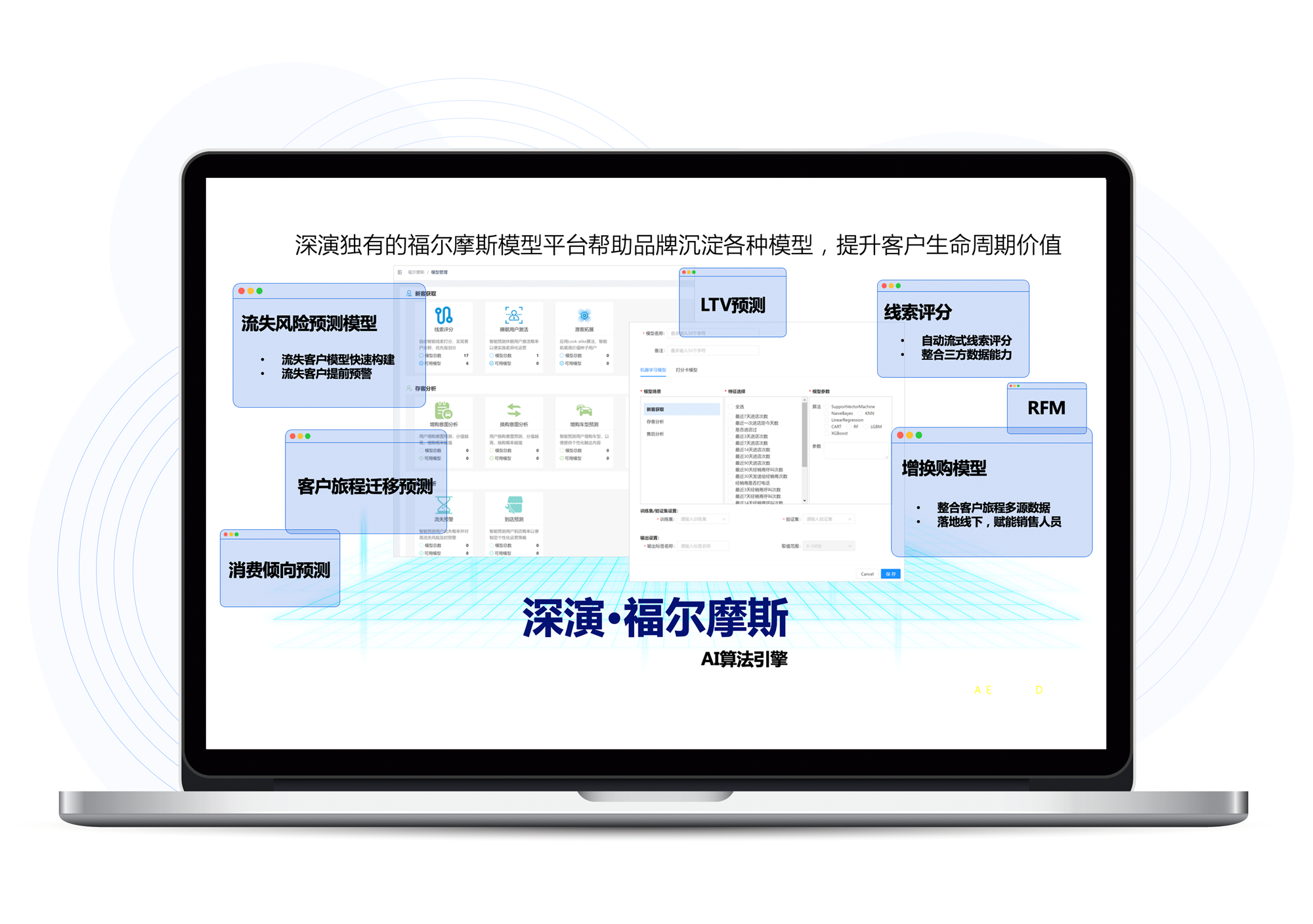 福尔摩斯AI是恒峰g22智能自主研发的AI算法模型平台,内嵌广告和用户运营两大模型体系,为恒峰g22智能营销决策云提供底层能力支撑,提升客户全生命周期价值